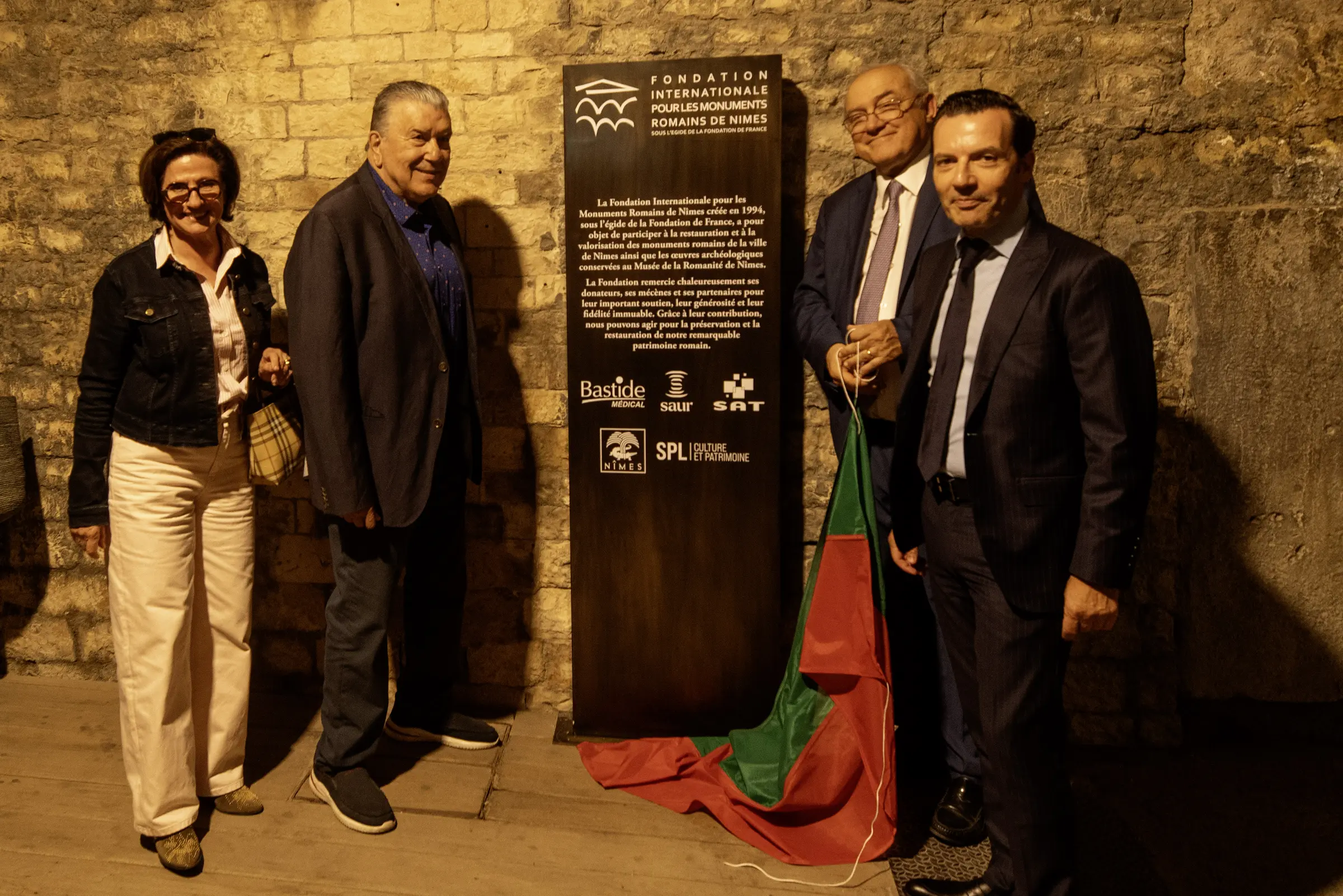 Cette plaque en bronze marque l’engagement fort et la fidélité du soutien de ces principaux mécènes et membres fondateurs à savoir : la SAUR, la Société d'Aménagement des Territoires, Bastide Le Confort Médical et la SPL Culture et Patrimoine. La cérémonie a été marquée par la présence de représentants de la Fondation, d’élus locaux, ainsi que des mécènes et partenaires, ce qui rappelle l’importance de la collaboration entre institutions publiques et privées pour préserver le patrimoine. Véritables partenaires pour la sauvegarde et la valorisation du remarquable patrimoine nîmois, c'est grâce à leur générosité que la Fondation peut continuer à contribuer à la préservation des monuments romains de Nîmes mais aussi à la restauration d'œuvres archéologiques conservées au Musée de la Romanité. Depuis sa création en 1994, la Fondation Internationale pour les Monuments Romains de Nîmes, abritée à la Fondation de France, a versé plus d’un million d’euros à la Ville de Nîmes, propriétaire et gestionnaire de ses monuments romains.