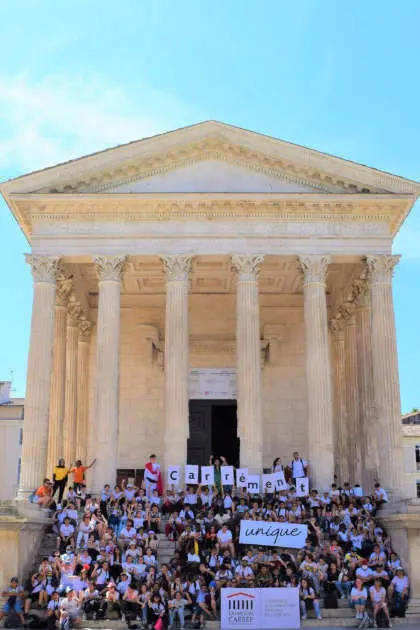 En mai 2023, 180 collégiens, issus de sept classes de collèges nîmois, partent à la découverte du patrimoine de la ville et des institutions symbolisant la République, de l’époque romaine à nos jours. La Maison Carrée esi un point d’étape de cette journée et de ce jeu de piste. L’occasion d’immortaliser ce moment en posant au pied du temple augustéen, symbole de paix… et de jeunesse éternelle.