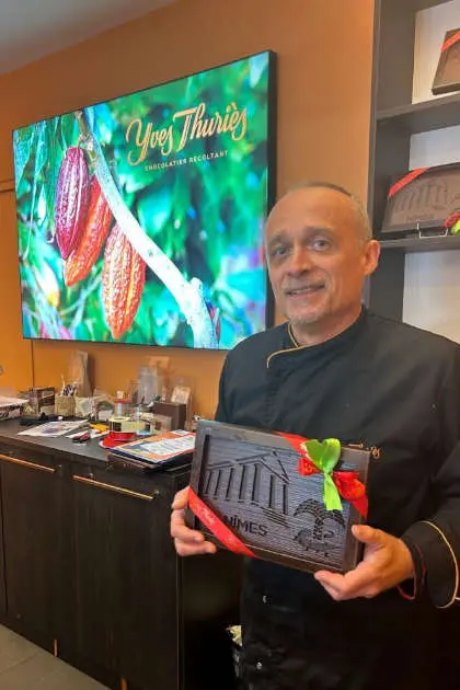 Dans le cadre des Journées du patrimoine (16 et 17 septembre), l’association Jemanimes et sa présidente, la plasticienne Guylaine Racheboom, sollicitent l’artisan chocolatier Charly Bascou pour réaliser des éléments de la Maison Carrée en chocolat. Baptisé le « Choco Carrée de Nîmes », cette création inédite en 3D met à l’honneur deux parties de l’édifice nîmois : le fronton réalisé en chocolat au lait 39%, et une colonne en chocolat noir 73% de Papouasie, bio et équitable. Prix de vente : 6€.