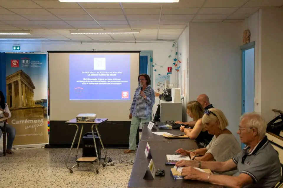 Réunion après réunion, Mary Bourgade, Adjointe déléguée à l’Inscription Unesco et au Patrimoine Antique, présente dans le détail le processus et le contenu du dossier nîmois aux différents Conseils de quartier de la ville de Nîmes. Un moyen d’informer et d’impliquer la population sur l’avancement de cette candidature.